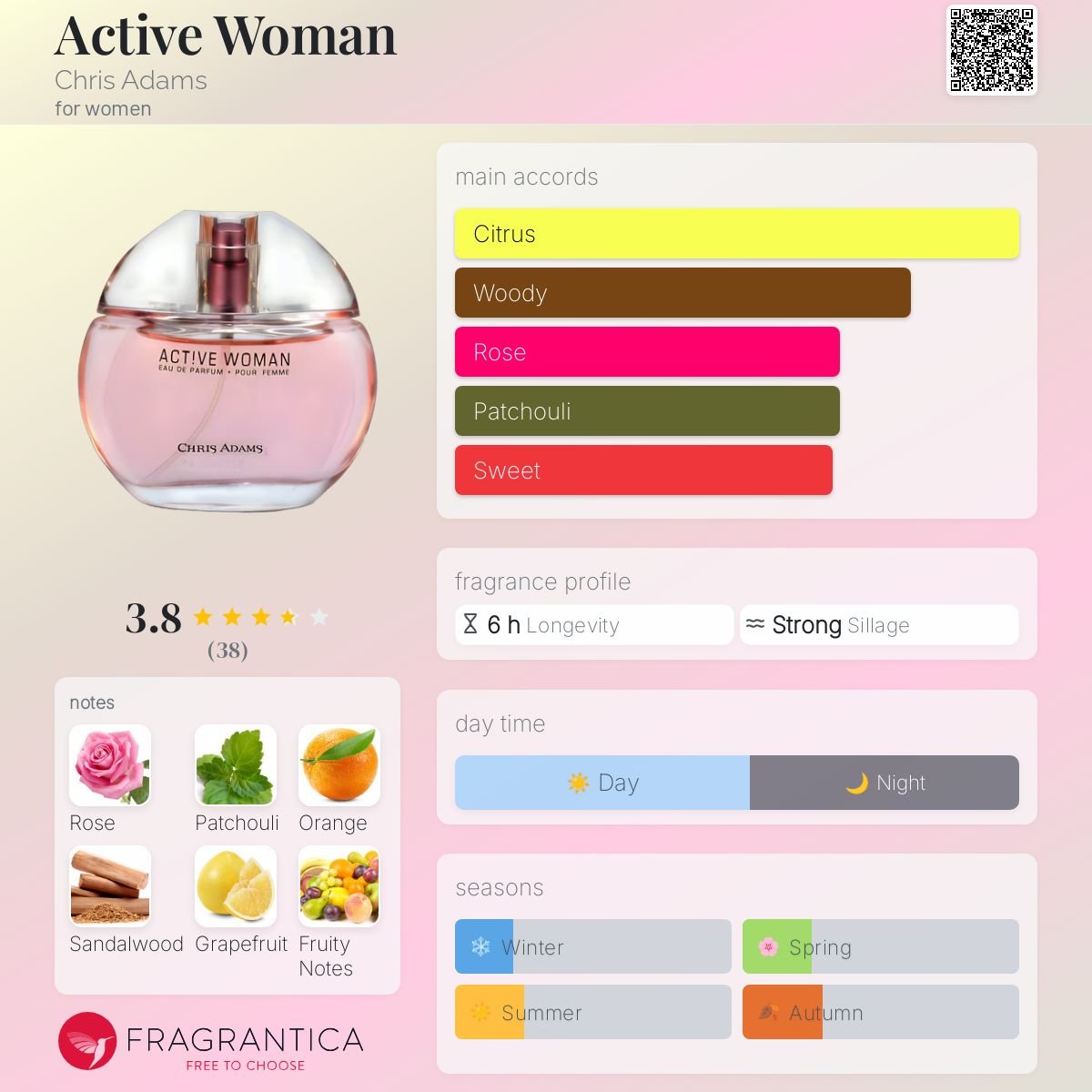 - Active Woman by Chris Adams is a Floral Woody Musk fragrance for women.