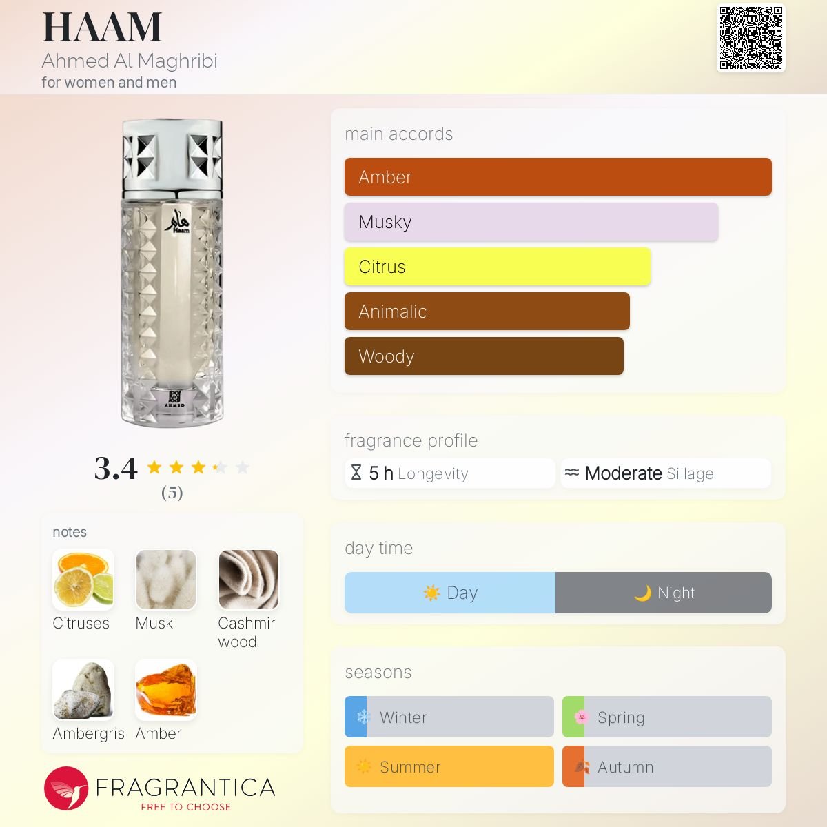 - HAAM by Ahmed Al Maghribi is a Floral Woody Musk fragrance for women and men.