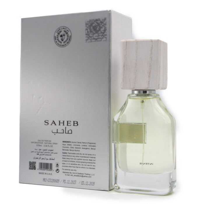 - New Ard Al Zaafaran Saheb Intense Eau de Parfum 70 ml for women and men with its scent and appearance.