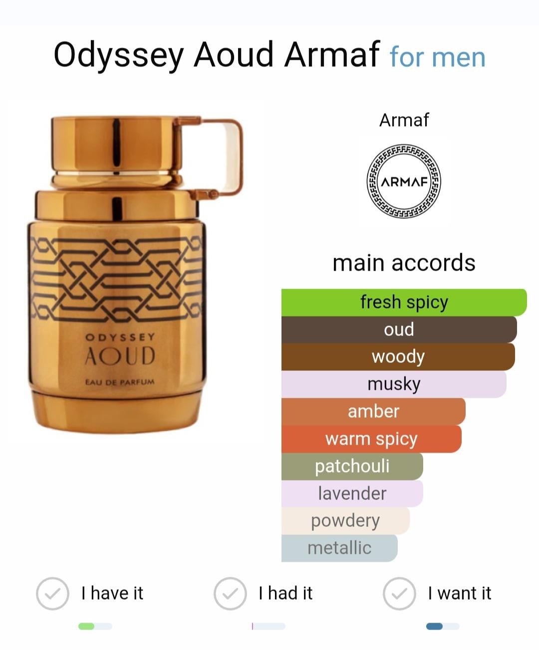 - Odyssey Aoud by Armaf is a Woody Spicy fragrance for men.