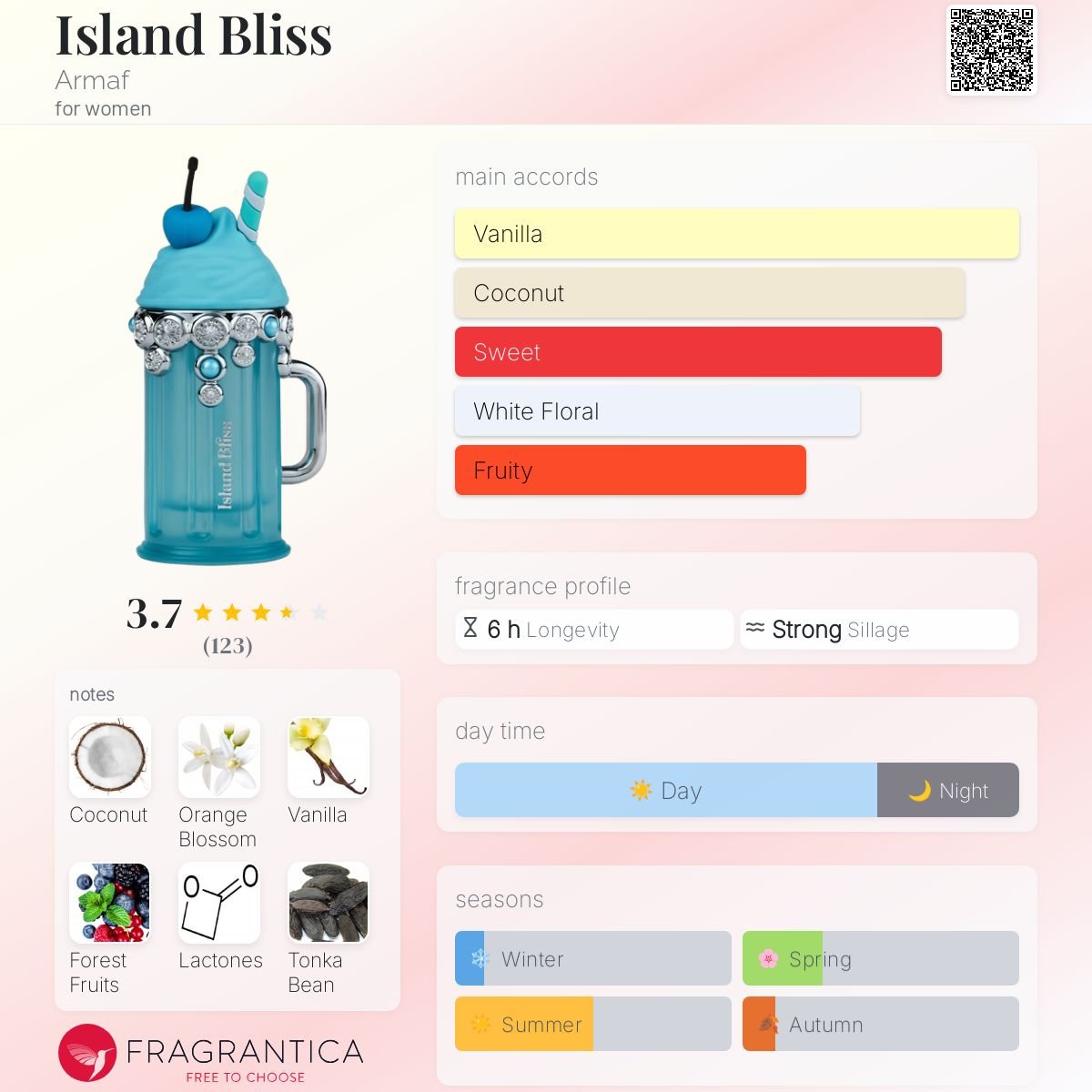 - Island Bliss by Armaf is a Floral Fruity Gourmand fragrance for women.