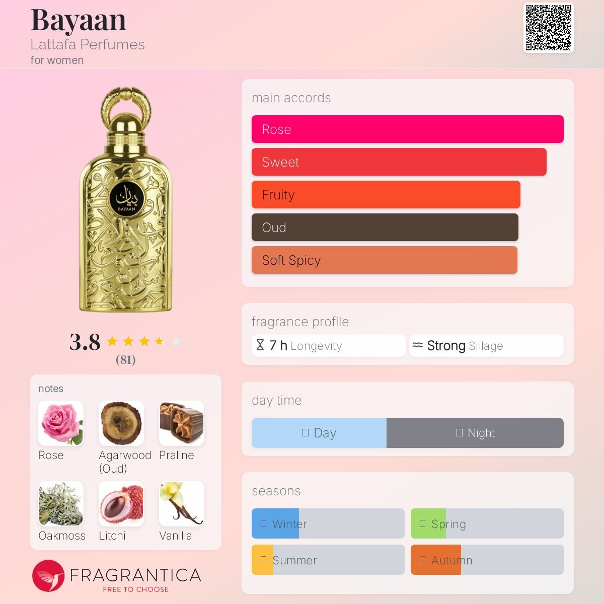 - Bayaan by Lattafa Perfumes is a Floral Fruity Gourmand fragrance for women.