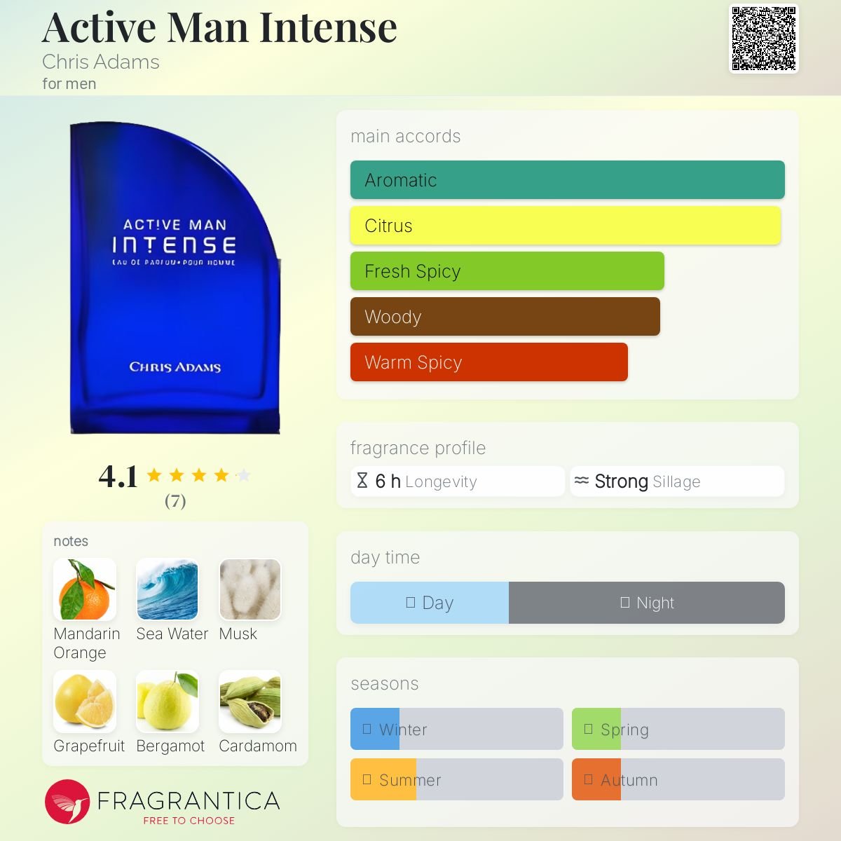• Active Man Intense by Chris Adams is a Woody Aromatic fragrance for men.