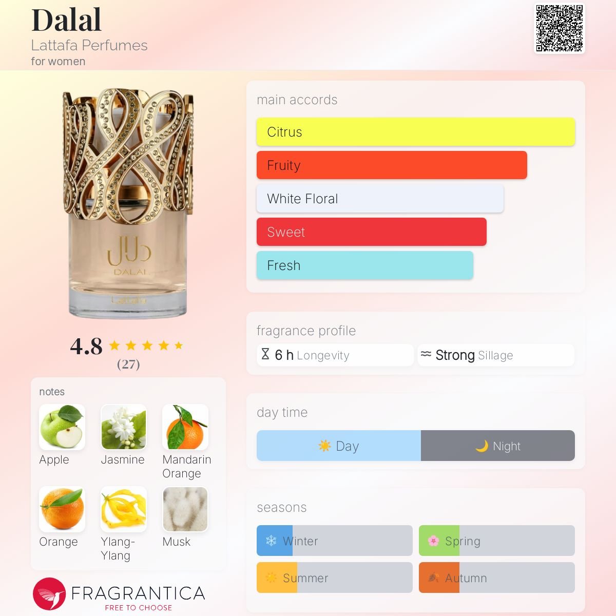 • Dalal by Lattafa Perfumes is a Floral Fruity Gourmand fragrance for women.