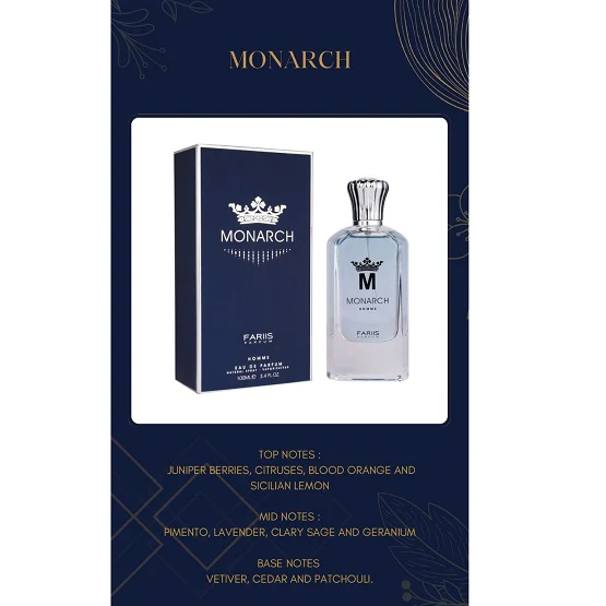 - FARIIS Monarch Eau De Parfum For Him is a refined fragrance that embodies timeless sophistication.Â