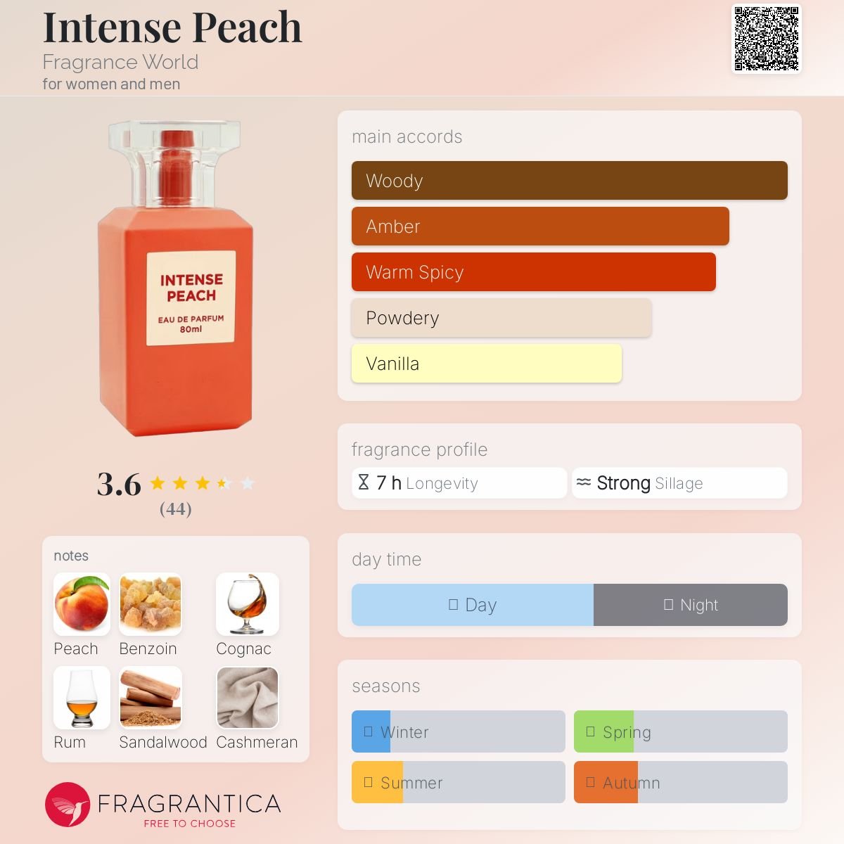 - Intense Peach by Fragrance World is a Oriental Vanilla fragrance for women and men.