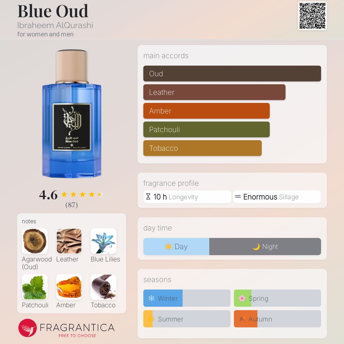 - Top notes are Oud and Blue Lilies;