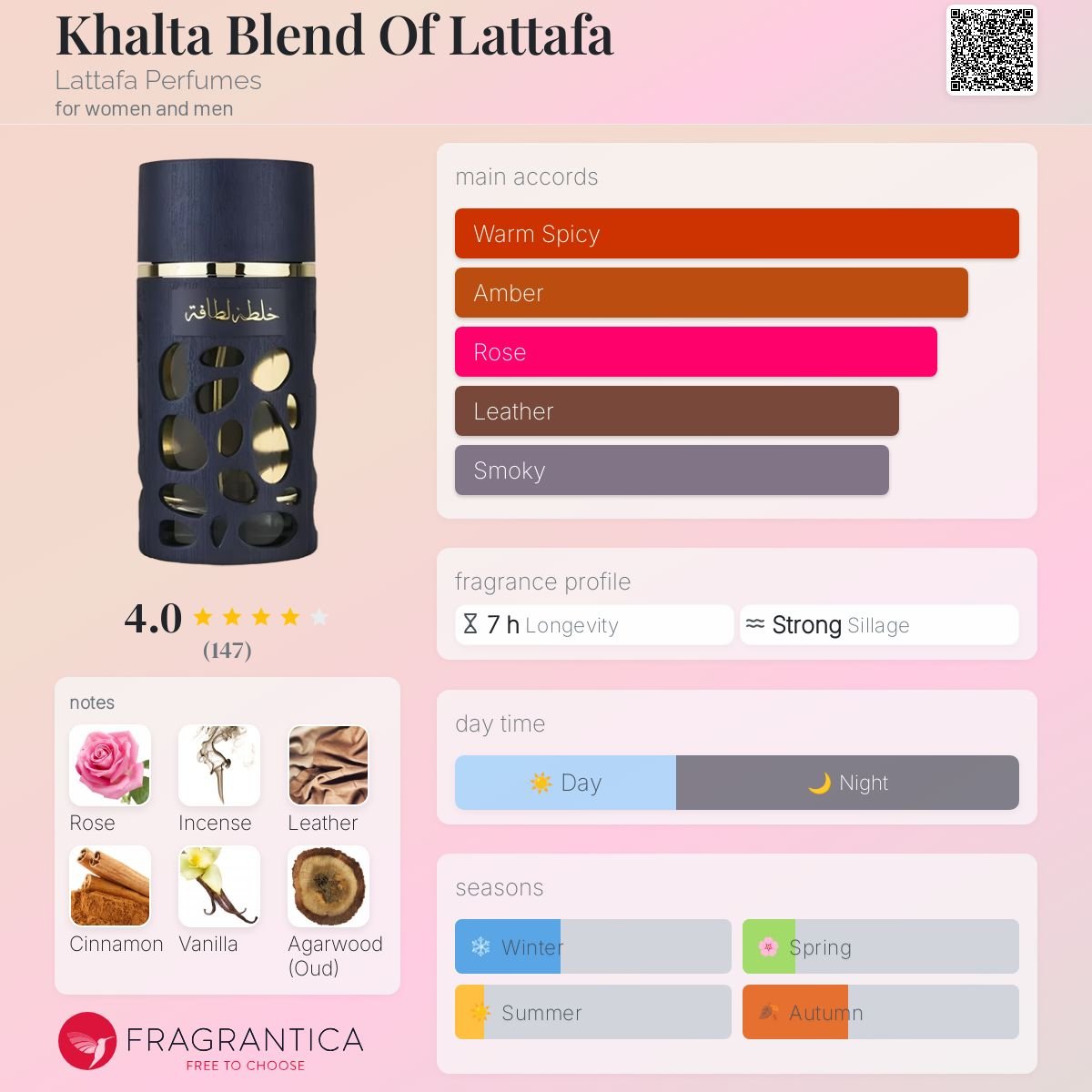 - Khalta Blend Of Lattafa by Lattafa Perfumes is a Oriental Woody fragrance for women and men.