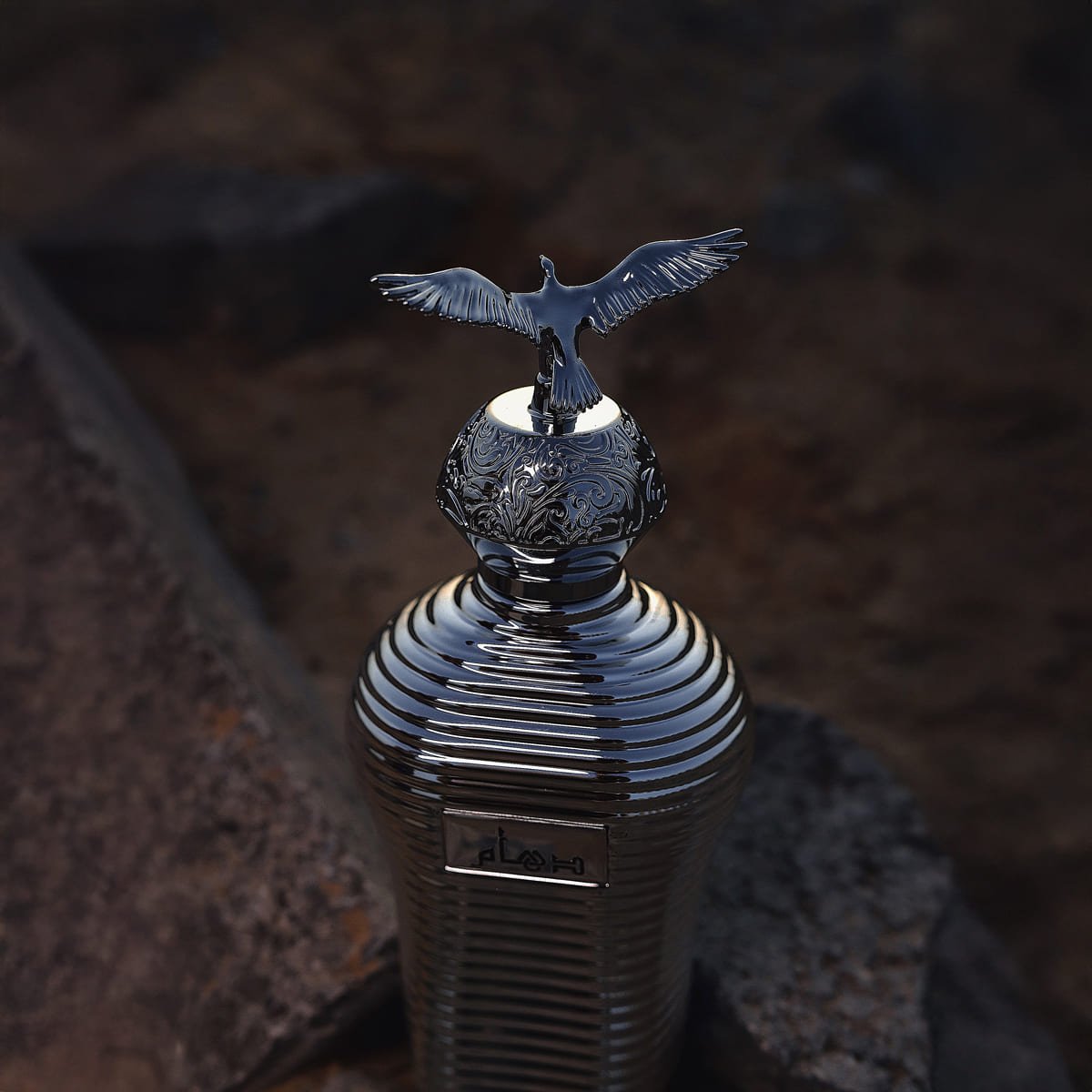 Daham describes the Arabian eagle, hence the shape of the cap. It is a fresh and spicy fragrance that projects youth and togetherness with strong presence of Cardamom and Pink Pepper to communicate warmth and versatility, blending seamlessly with middle notes of Sage and juicy Melon, while the smoky Vanilla forms a magical bond with the Chestnut note to ensure a complement is on the way.