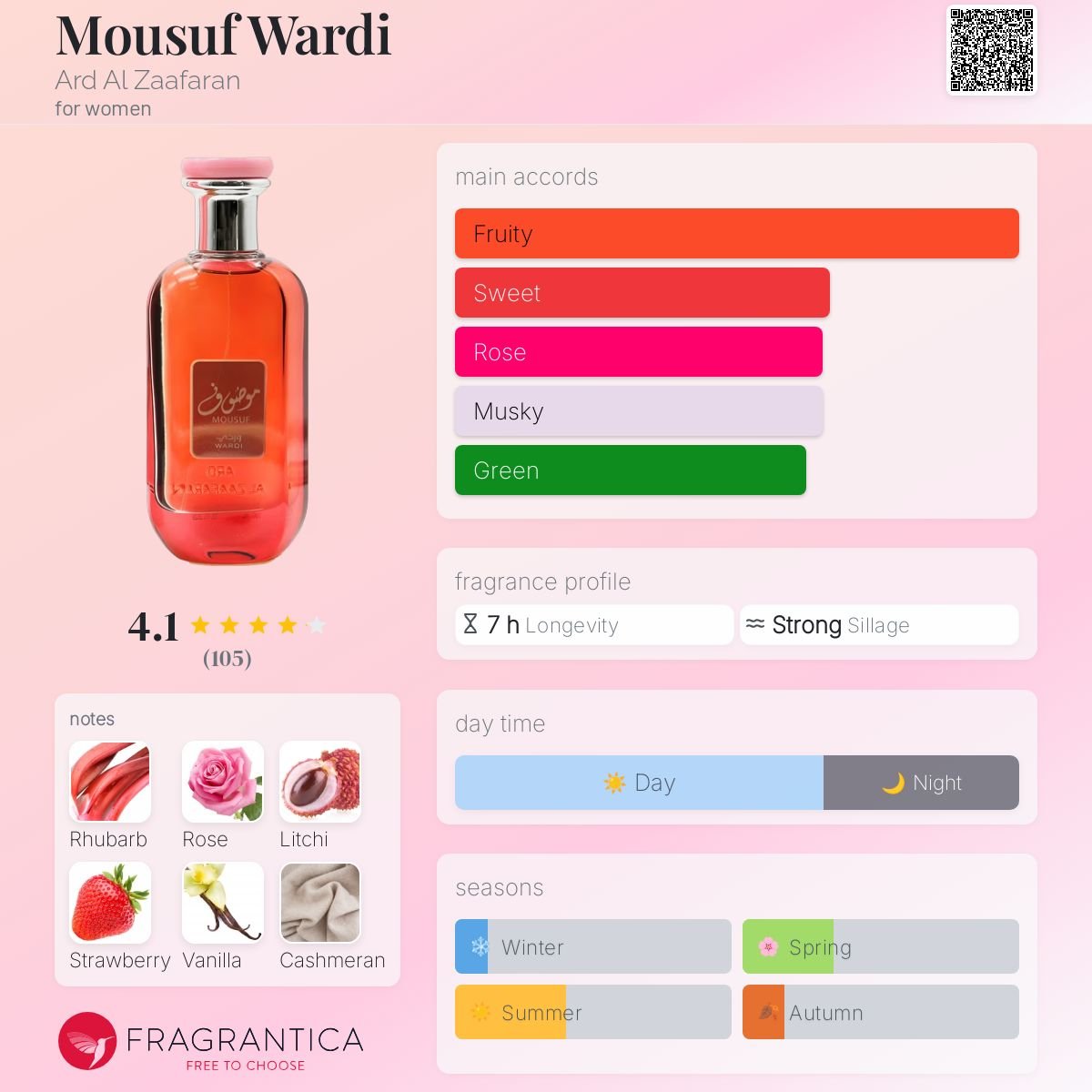 - Mousuf Wardi by Ard Al Zaafaran is a Floral Fruity Gourmand fragrance for women.