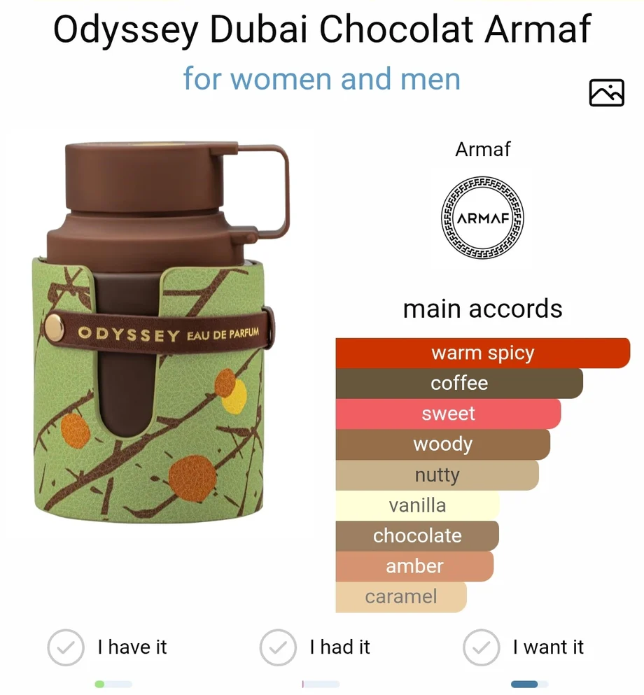 • Odyssey Dubai Chocolat by Armaf is a Oriental Vanilla fragrance for women and men.