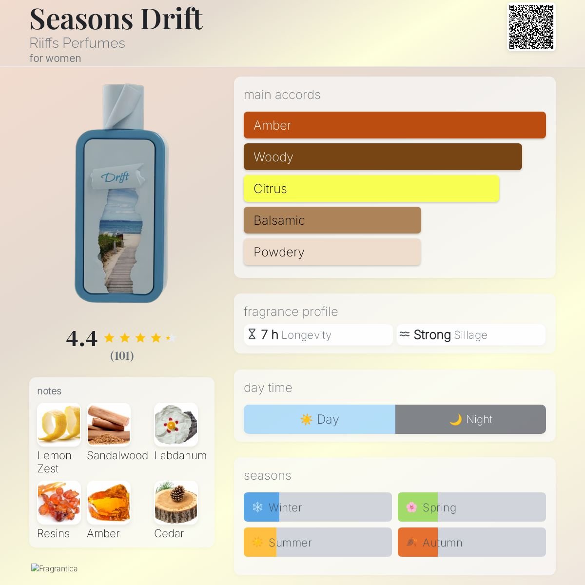 - Seasons Drift by Riiffs Perfumes is a Floral Fruity fragrance for women.
