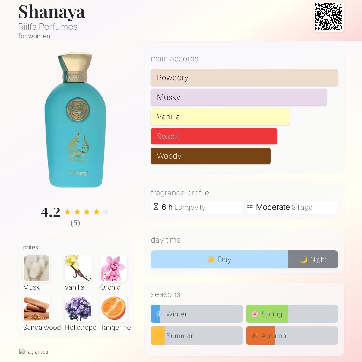 • Shanaya by Riiffs Perfumes is a Floral Woody Musk fragrance for women.