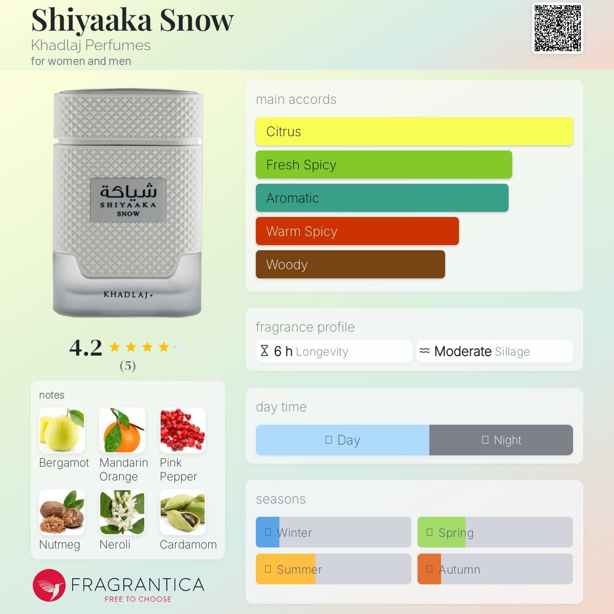 - Shiyaaka Snow by Khadlaj Perfumes is a Citrus Aromatic fragrance for women and men.
